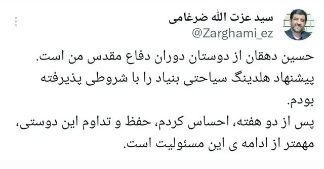 ضرغامی بدون آنکه اشارهای به دلیل این ماجرا داشته باشد، نوشته است: «حسین دهقان از دوستان دوران دفاع مقدس من است. پیشنهاد هلدینگ سیاحتی بنیاد را با شروطی پذیرفته بودم. پس از دو هفته، احساس کردم حفظ و تداوم این دوستی، مهمتر از ادامه این سمت است.»