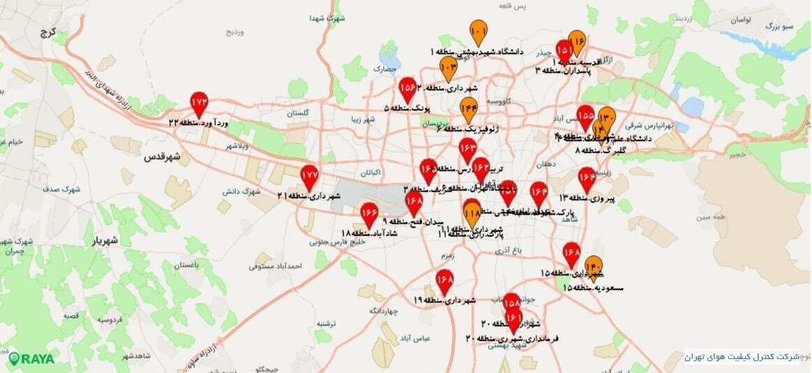 به گزارش تهران خبر به نقل از خبرآنلاین، بر اساس دادههای شرکت کنترل کیفیت هوای تهران، کیفیت هوای امروز در پایتخت، در اکثر مناطق در شرایط “ناسالم” قرار دارد. همچنین میانگین غلظت ذرات معلق کمتر از ۲.۵ میکرون، که آلاینده اصلی تهران در روز گذشته نیز بوده است، هماکنون عدد ۱۵۲ را نشان میدهد. تسنیم نوشت: