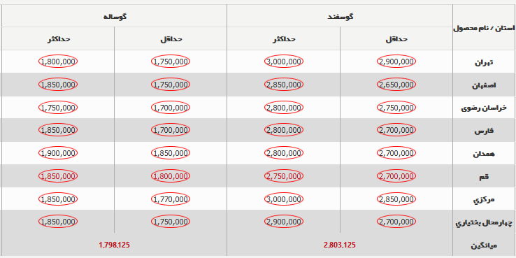 به گزارش خبرگزاری تهران خبر به نقل از خبرآنلاین، گزارشها حاکی از آن است که در استان تهران هر کیلو گوسفند زنده حداقل ۲۹۰ هزار تومان و حداکثر ۳۰۰ هزار تومان قیمت پیدا کرد. هر کیلو گوساله زنده نیز بین ۱۷۵ تا ۱۸۰ هزار تومان به فروش میرفت. در استان اصفهان نیز قیمتها تغییر کرد؛ به طوری